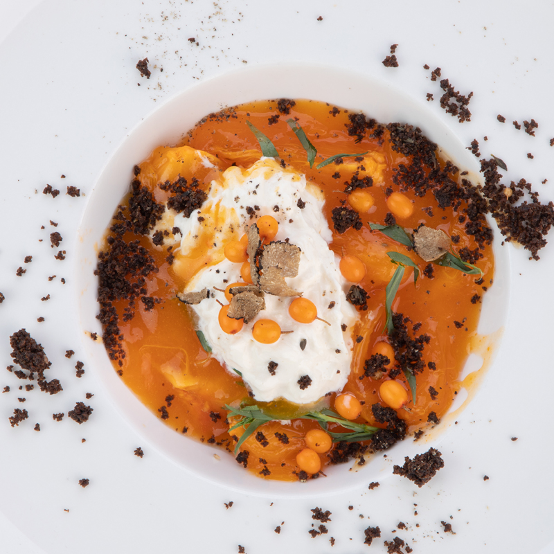 Погрузитесь в мир утонченного вкуса с нашим салатом с хурмой, страчателлой и трюфелем. Сочная хурма, нежная страчателла и ароматный трюфель - это идеальное сочетание для истинных гурманов. Добавление облепихи придает салату нотку свежести, а хрустящая крошка придает ему текстуру и уникальный вкус. Раскройте свой вкусовой потенциал и насладитесь этим изысканным блюдом прямо у нас в ресторане или у себя дома, заказав доставку. Попробуйте салат с хурмой, страчателлой и трюфелем уже сегодня и погрузитесь в мир непревзойденного вкуса от The Truffle.